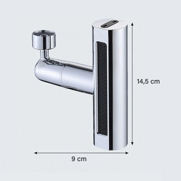 Materijal: kućište od ABS plastike + mesingani priključak Dimenzije: 14,5 x 9 cm Načini prskanja: 3 (mlaz, mjehuričasti tok, maglica) Rotacija: 360° Kompatibilnost: odgovara većini standardnih slavina (pogledajte upute za specifikacije navoja) Vrijeme instalacije: manje od 30 sekundi Potreban alat: nijedan