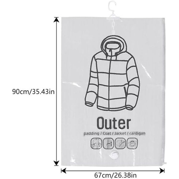 Povećajte prostor u garderobi održavajući ga organiziranim u svim godišnjim dobima. Koristite ove viseće kompresibilne vrećice za pohranjivanje velikih, glomaznih ili zastarjelih odijela, haljina, debelih prsluka, jakni i kaputa u vašem ormaru. Naše vakuum vreće za pohranu štite vašu odjeću od vode i mirisa, što ih čini idealnima za dugotrajnu upotrebu.